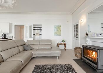 - Wood burner and leather sofa